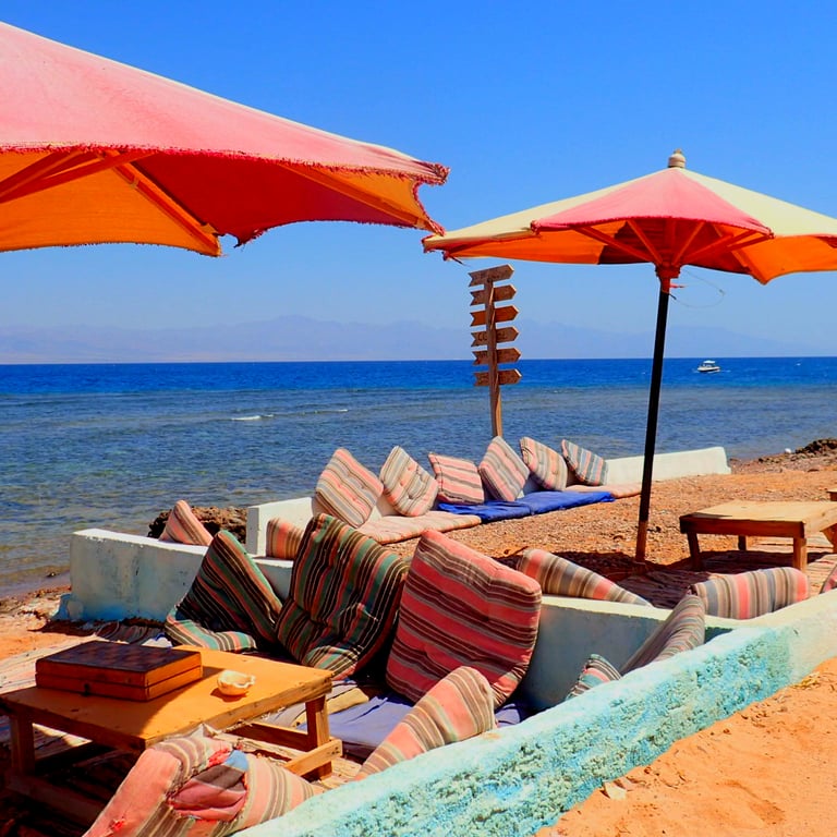 Ons strand bij Bedouin Star ligt in Ras Shitan, Nuweiba, Egypte. Het is een ideale bestemming voor een ontspannen strandvakantie. Dankzij de perfecte locatie zijn we gemakkelijk bereikbaar vanaf de grens met Taba, op slechts 45 minuten rijden, of vanaf de luchthaven van Sharm el Sheikh, een handige reis van 1,5 uur.